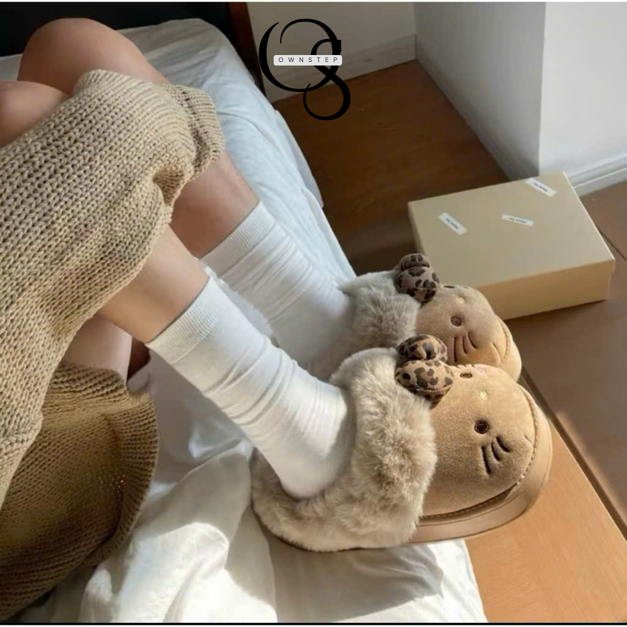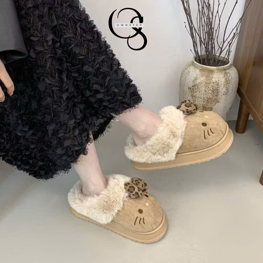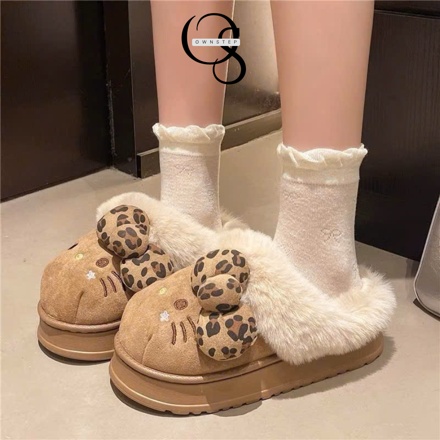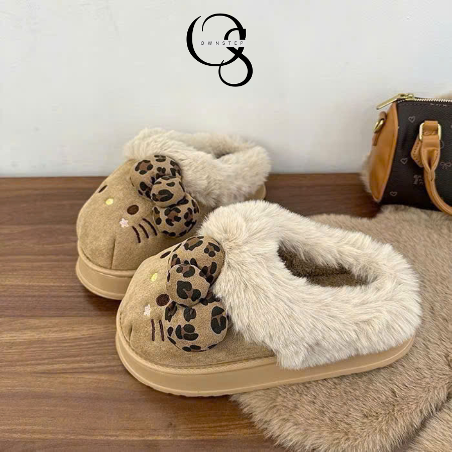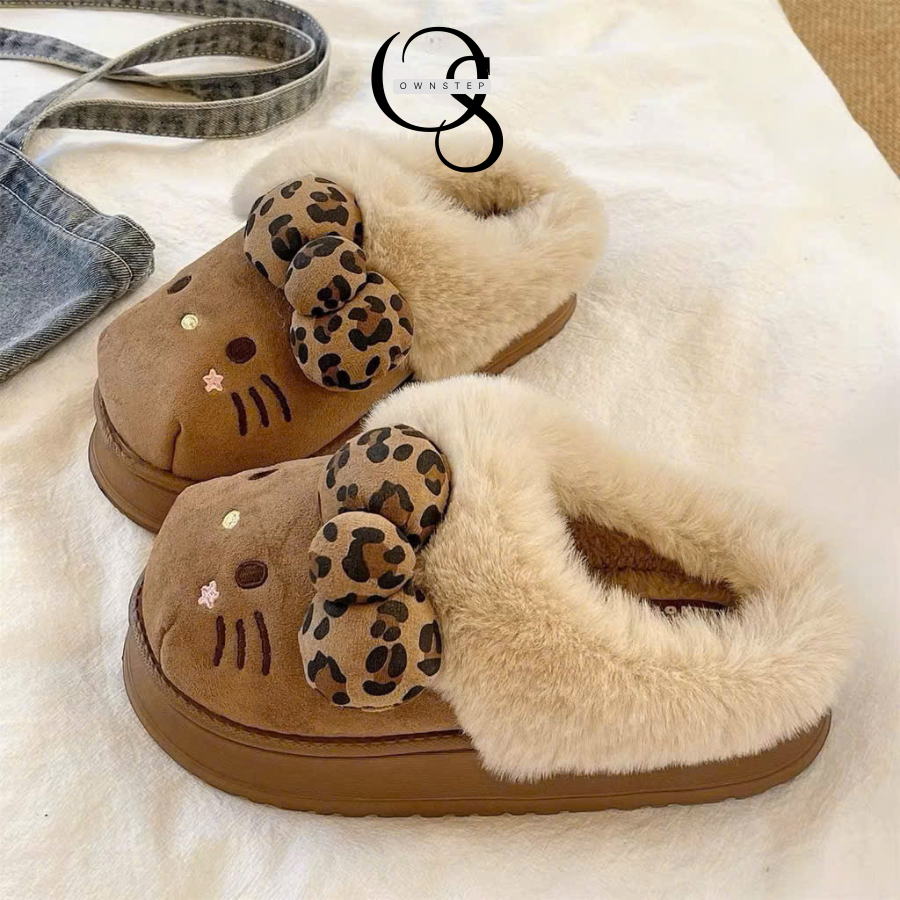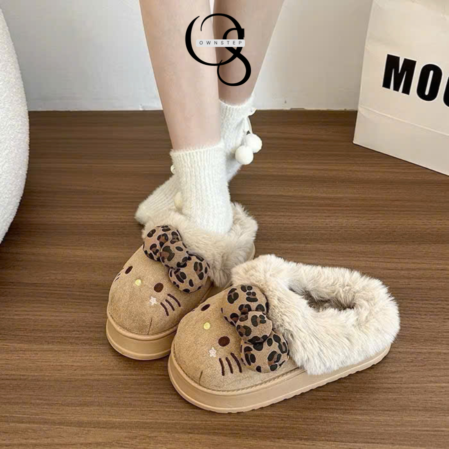 Dép Lông Nữ Hình Mèo Kitty Đính Nơ Cute, Dép Đi Trong Nhà Mùa Đông Đế Cao 4cm Êm Ấm