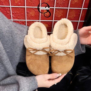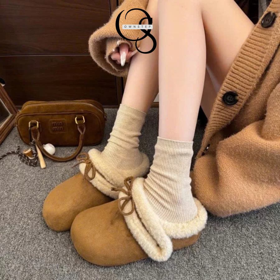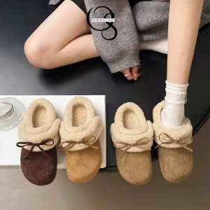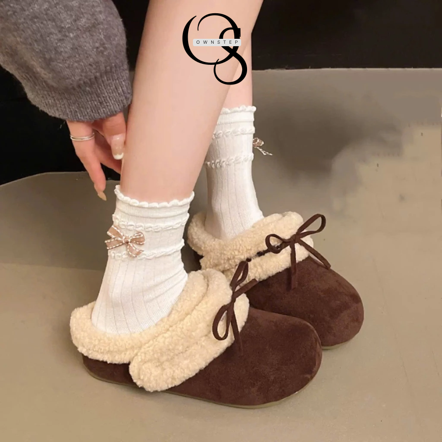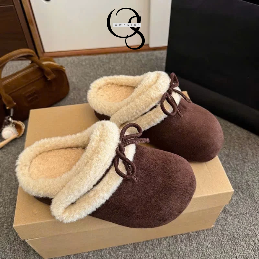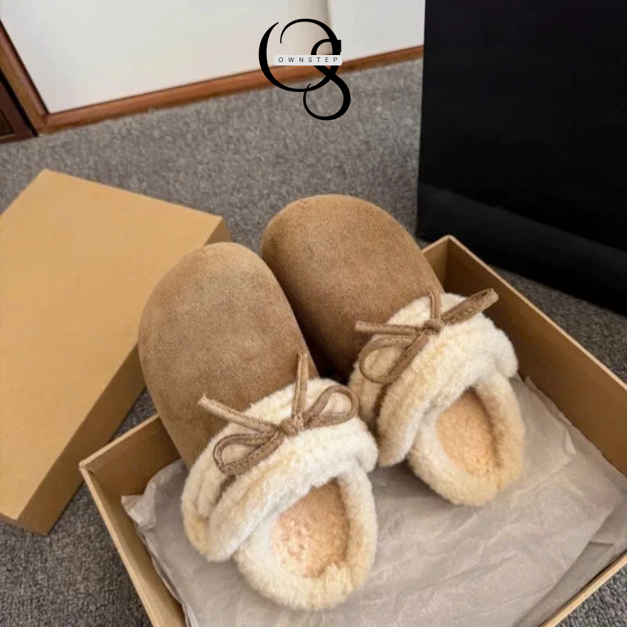 Dép sục lông cừu nữ quai dán phối nơ xinh, siêu êm ái, giữ ấm tốt, QCCC FULLBOX